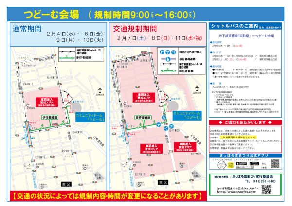 また、すすきの会場では、会場の設営のため1月30日(金)、31日(の両日、夜間(午後11時00分ころから翌日午前7時00分ころまで)臨時の交通規制が行われます。
